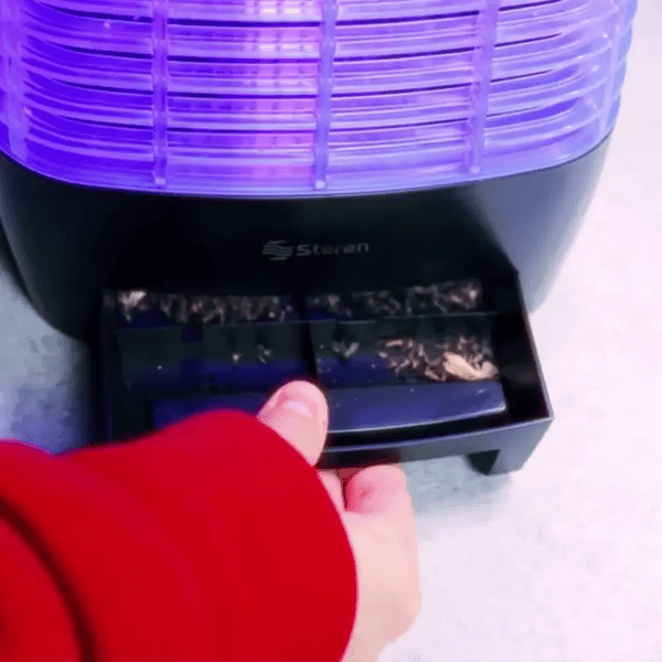 Funciona con una luz UV de longitud precisa que atrae mosquitos y bichos. Una vez se acercan, quedan atrapados dentro del dispositivo sin químicos ni olores.